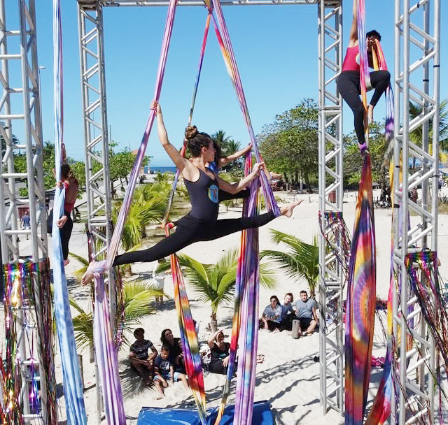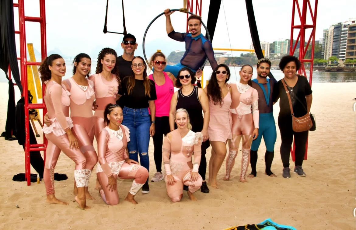 Fundado pela artista e educadora Juliana Berti em 2020, o Projeto Pendurados nasceu em plena pandemia e hoje é referência na cidade. As aulas acontecem na Praia de Icaraí, onde dezenas de alunas treinam acrobacias em liras, trapézios e tecidos — aparelhos que exigem força física, equilíbrio e confiança.