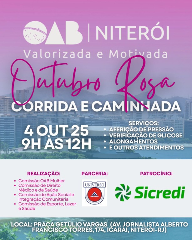 A OAB Niterói realiza, no sábado, 4 de outubro, a Corrida e Caminhada Outubro Rosa para reforçar a prevenção e o diagnóstico precoce do câncer de mama. A ação é gratuita, sem necessidade de inscrição, e oferece serviços de saúde à população.