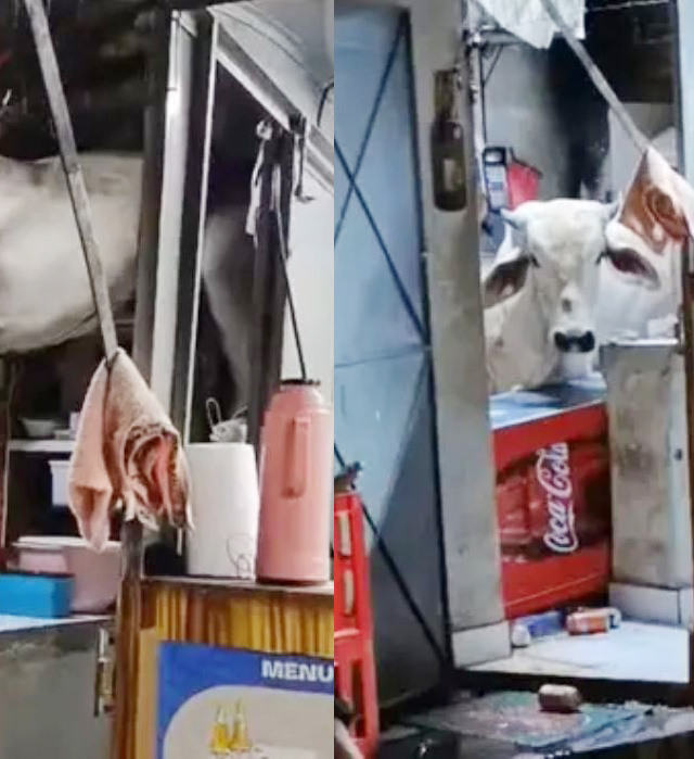 O animal, que havia fugido de uma propriedade próxima, correu descontroladamente e, de alguma forma, alcançou a cobertura do estabelecimento. O telhado não resistiu ao peso e cedeu, provocando um “rebuliço” completo na cozinha.