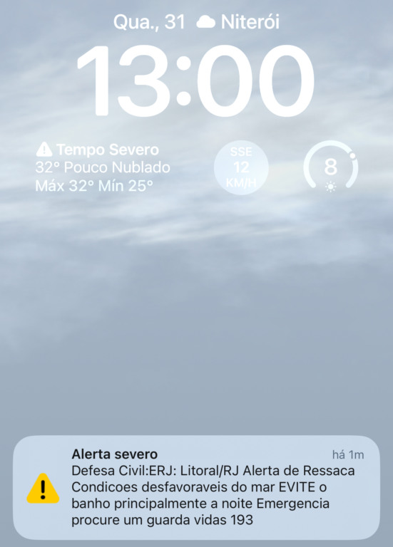 Moradores do Rio de Janeiro receberam, às 13h desta quarta-feira (31), um alerta severo da Defesa Civil diretamente no celular sobre a ressaca no litoral do estado. O comunicado reforça que as condições do mar são desfavoráveis e que o banho de mar deve ser evitado, principalmente à noite, período de maior risco.
