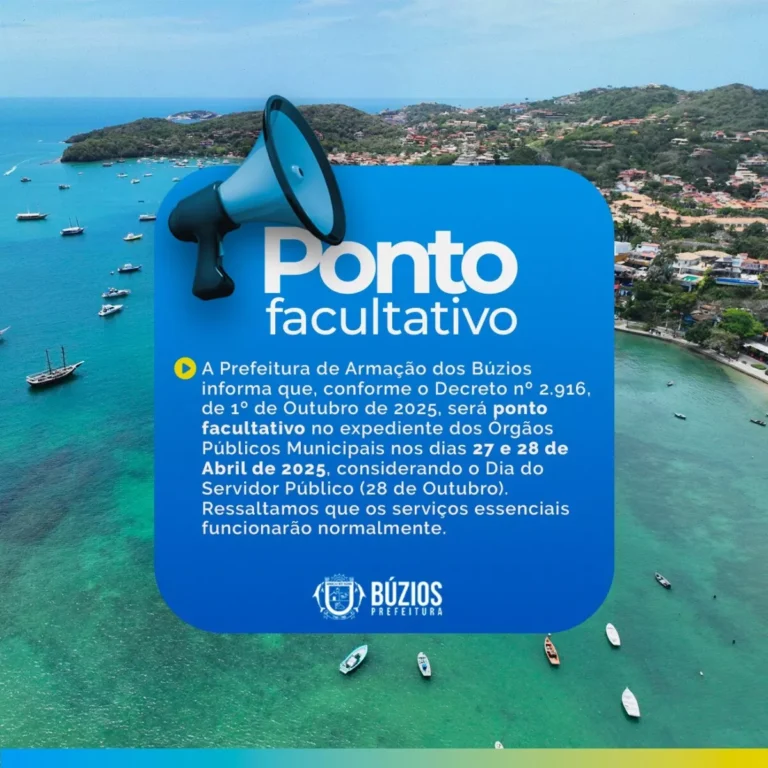 Armação dos Búzios - A Prefeitura de Armação dos Búzios, na Região dos Lagos do Rio de Janeiro, publicou o Decreto Municipal nº 2.916, que estabelece ponto facultativo nos dias 27 e 28 de outubro, em homenagem ao Dia do Servidor Público, celebrado no dia 28.