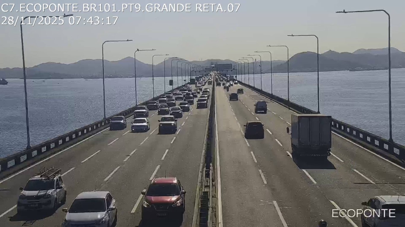 O fluxo de veículos na Ponte Rio–Niterói teve início de manhã marcado por lentidão no sentido Rio e travessia tranquila em direção a Niterói nesta sexta-feira de Black Friday, segundo dados atualizados pela Ecovias Ponte.