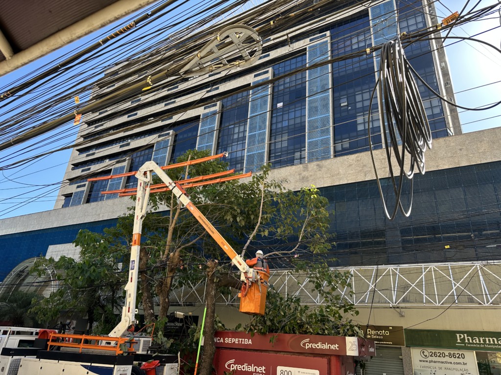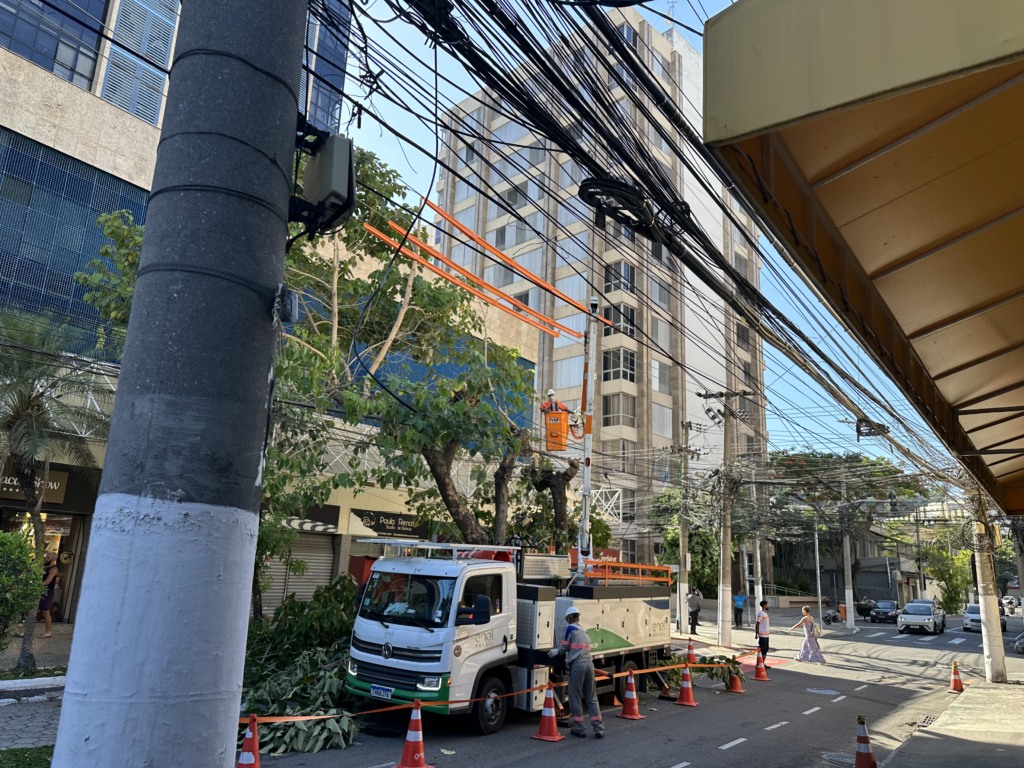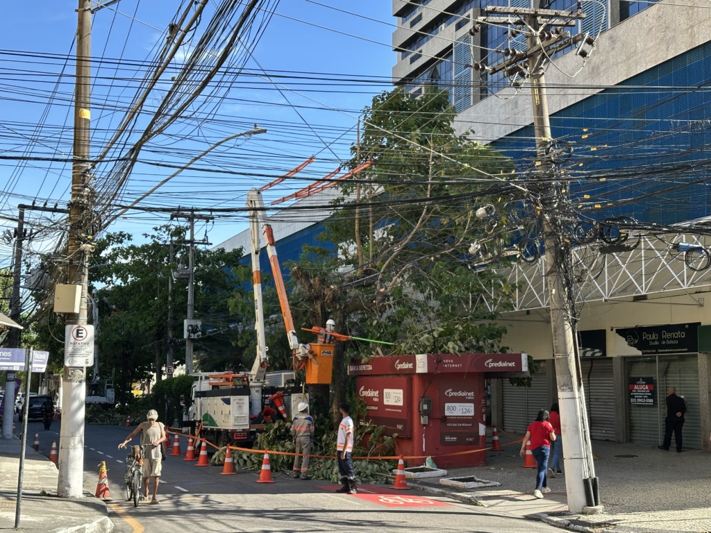 Segundo apuração no local, a intervenção foi necessária devido ao grande volume de fios misturados à vegetação, situação comum em áreas centrais de Niterói, onde a fiação aérea se acumulou ao longo dos anos.