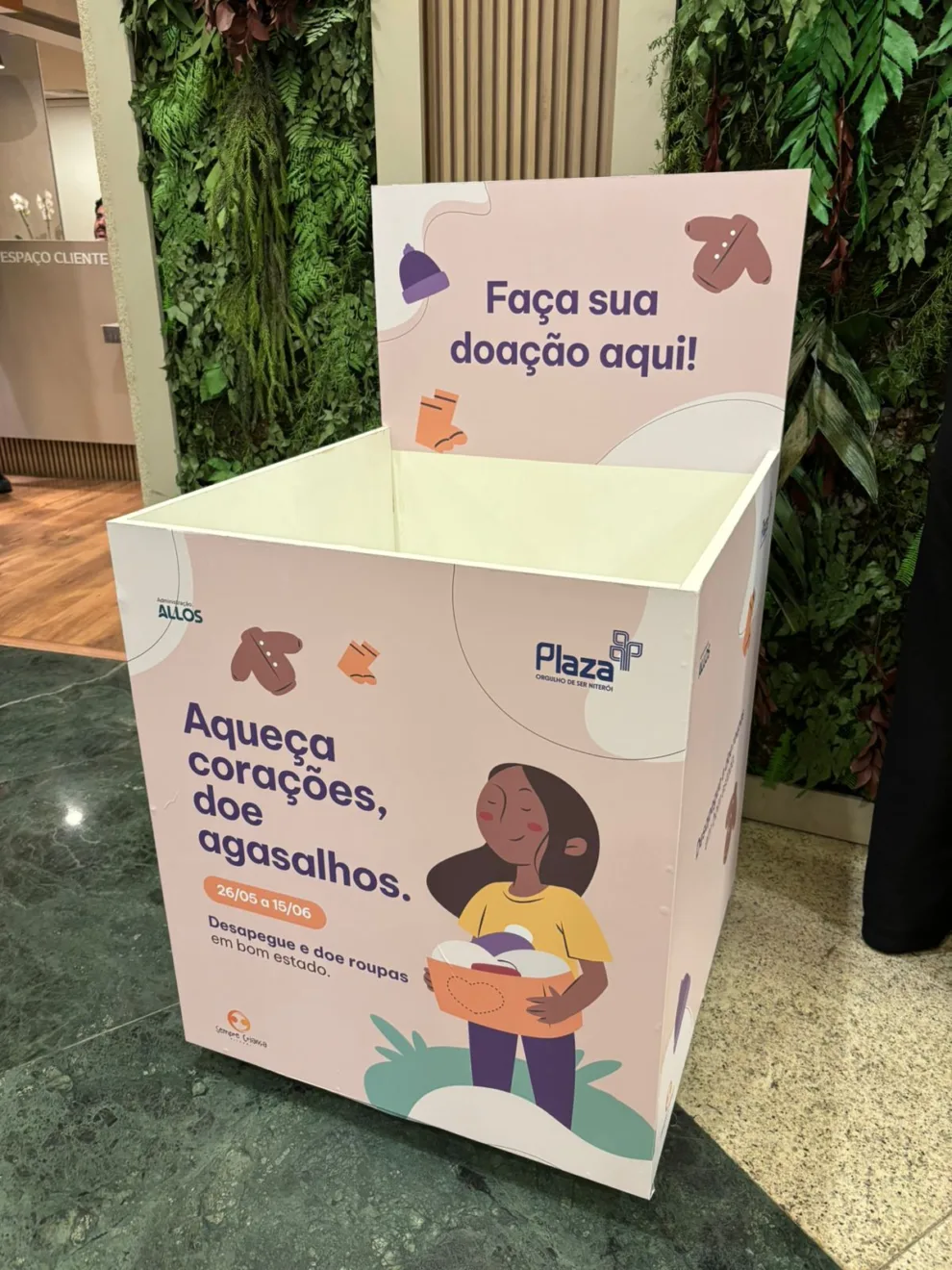 Com a chegada das baixas temperaturas, o Plaza Niterói, administrado pela ALLOS, participa da Campanha Nacional de Arrecadação de Agasalhos, que acontece de 26 de maio a 15 de junho. O objetivo é ajudar mais de mil crianças, adolescentes e suas famílias atendidas pelo projeto social Sempre Criança Niterói, que atua em comunidades de Niterói e São Gonçalo.