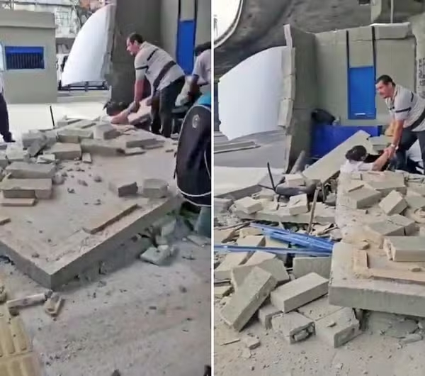Imagens feitas por testemunhas mostram o momento em que a mulher é amparada e retirada dos escombros após o impacto.