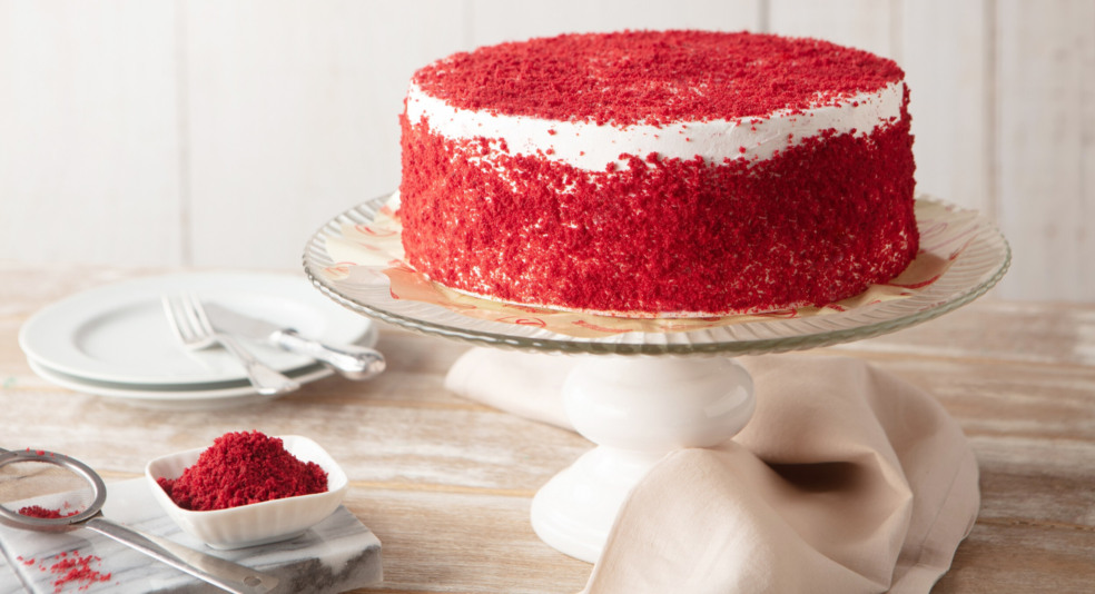 Receita com massa vermelha à base de chocolate, três camadas de buttercream e cobertura de chantilly finalizada com farelos de massa vermelha no topo e laterais. Disponível em três formatos: