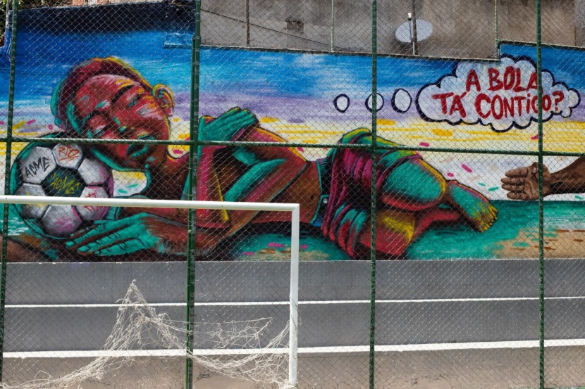 “O painel foi pensado como uma história bonita que ficasse para revitalizar a quadra. Pintei uma juíza que apita ao olhar para o menino dormindo sobre a bola, como um despertar simbólico, eternizando a presença dele ali. O objetivo também foi criar um elo entre os murais da comunidade”, conta a artista Airá.