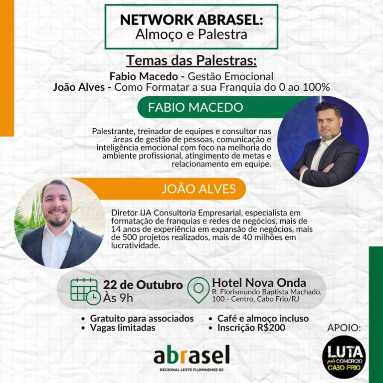 Empresários e empreendedores do setor de alimentação terão, em 22/10, um dia de conteúdo e conexões em Cabo Frio. O Network Abrasel: Almoço e Palestra reúne capacitação prática, troca de experiências e oportunidades de negócios para bares e restaurantes.