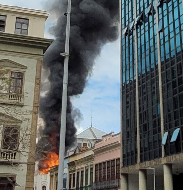 URGENTE | CENTRO DO RIO • Ouvintes da BandNews FM Rio alertam para um incêndio de grandes proporções na Rua Luís de Camões, no Centro do Rio. As chamas atingem um suposto depósito localizado no local próximo ao Real Gabinete Português de Leitura.