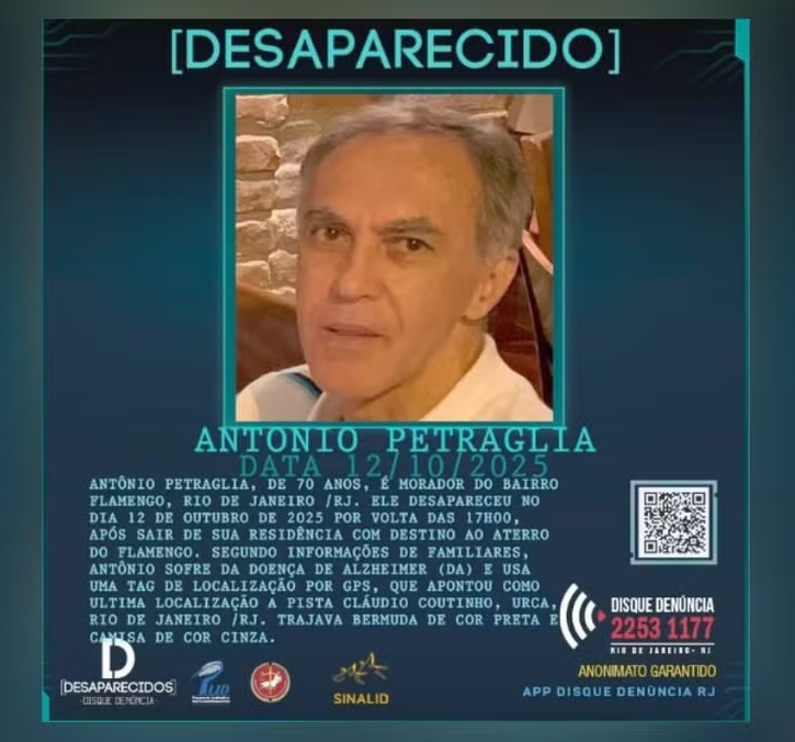 As buscas pelo professor aposentado da UFRJ, Antonio Petraglia, de 70 anos, continuam mobilizando forças de segurança e familiares. O idoso está desaparecido desde o dia 12 de outubro, quando foi visto pela última vez entrando na pista Cláudio Coutinho, na Urca, Zona Sul do Rio de Janeiro.