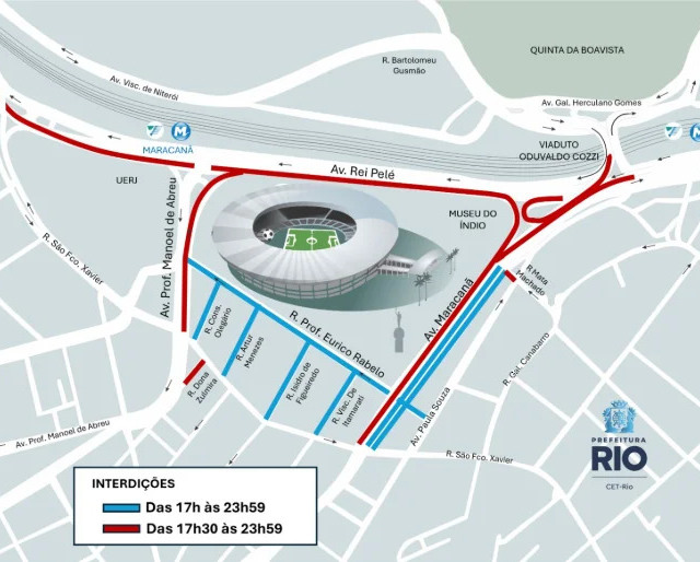 As primeiras proibições começam às 10h, enquanto as interdições viárias entram em vigor a partir das 17h, com operações estendidas até 23h59. O objetivo é organizar o fluxo de veículos e garantir segurança na região do estádio.