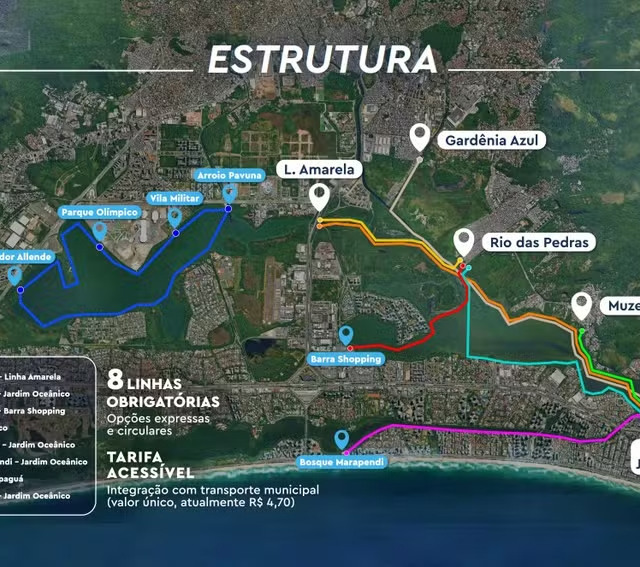 E seis estações/píeres: Arroio Pavuna, Barra Shopping, Bosque Marapendi, Parque Olímpico, Salvador Allende e Vila Militar.