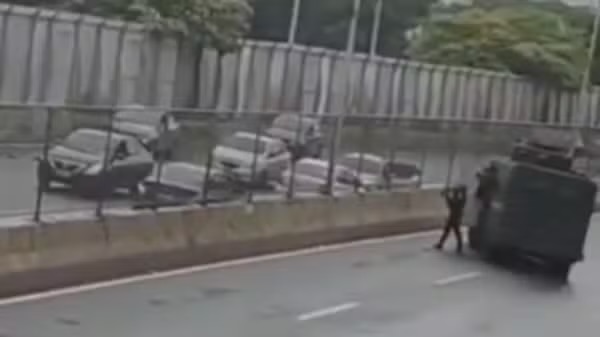 Em um dos vídeos compartilhados nas redes sociais, é possível ver o momento exato em que uma pessoa é baleada e cai no chão. Outros registros mostram motoristas parados e tentando se proteger enquanto o blindado da PM avança pela via.