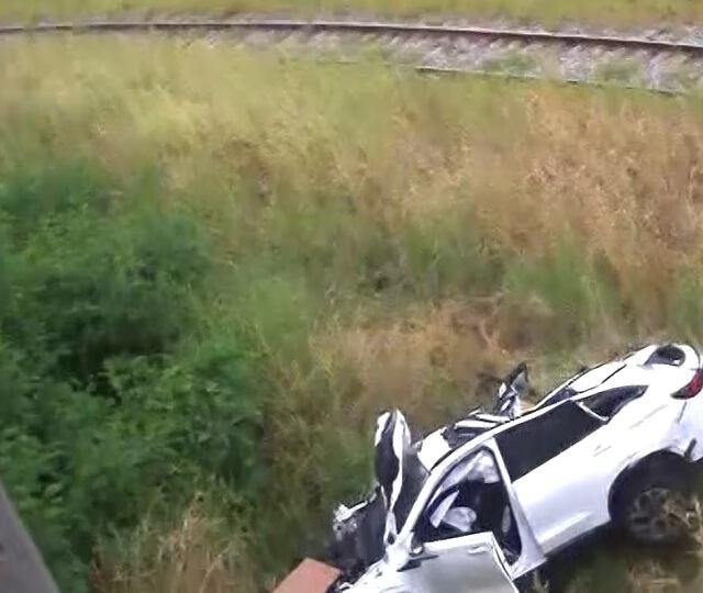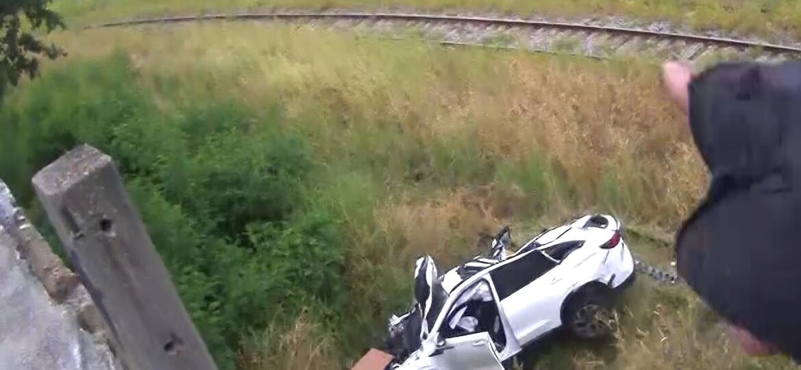 Durante a fuga, os suspeitos colidiram contra cinco veículos, entre carros e motos, além de atingirem um muro, antes de o automóvel cair na linha férrea.