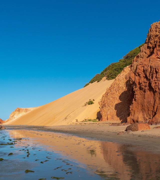 Considerada um dos cartões-postais de Beberibe, a Praia das Fontes atrai visitantes especialmente pelas águas transparentes e pelas formações de falésias coloridas que emolduram a paisagem. A região é conhecida pelas fontes de água doce que brotam entre as dunas, criando um contraste cênico com as piscinas naturais e o mar calmo.