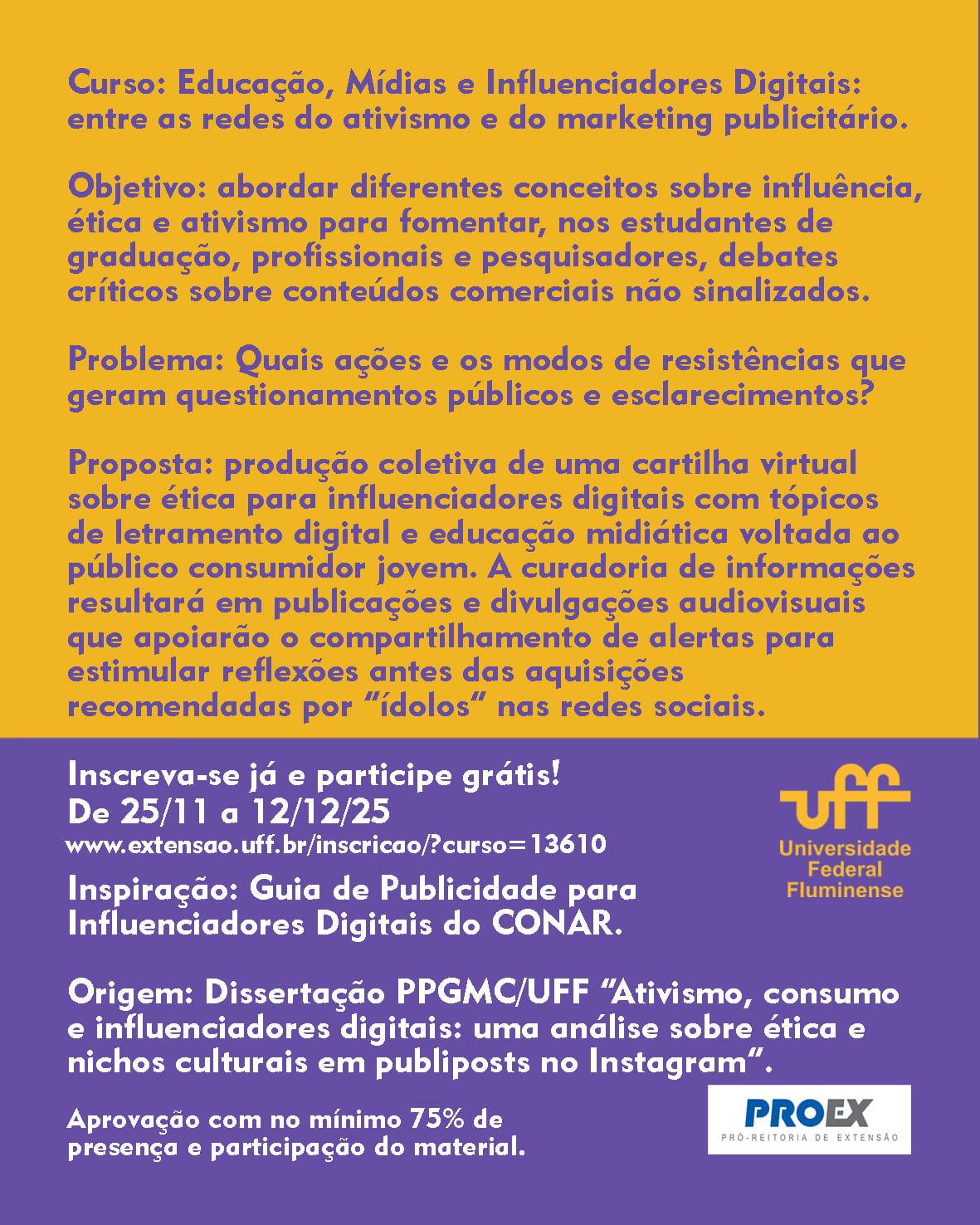 O curso de extensão “Educação, Mídias e Influenciadores Digitais: entre as redes do ativismo e do marketing publicitário” será ofertado de forma gratuita para a população de Niterói, a comunidade acadêmica da UFF e a sociedade em geral.