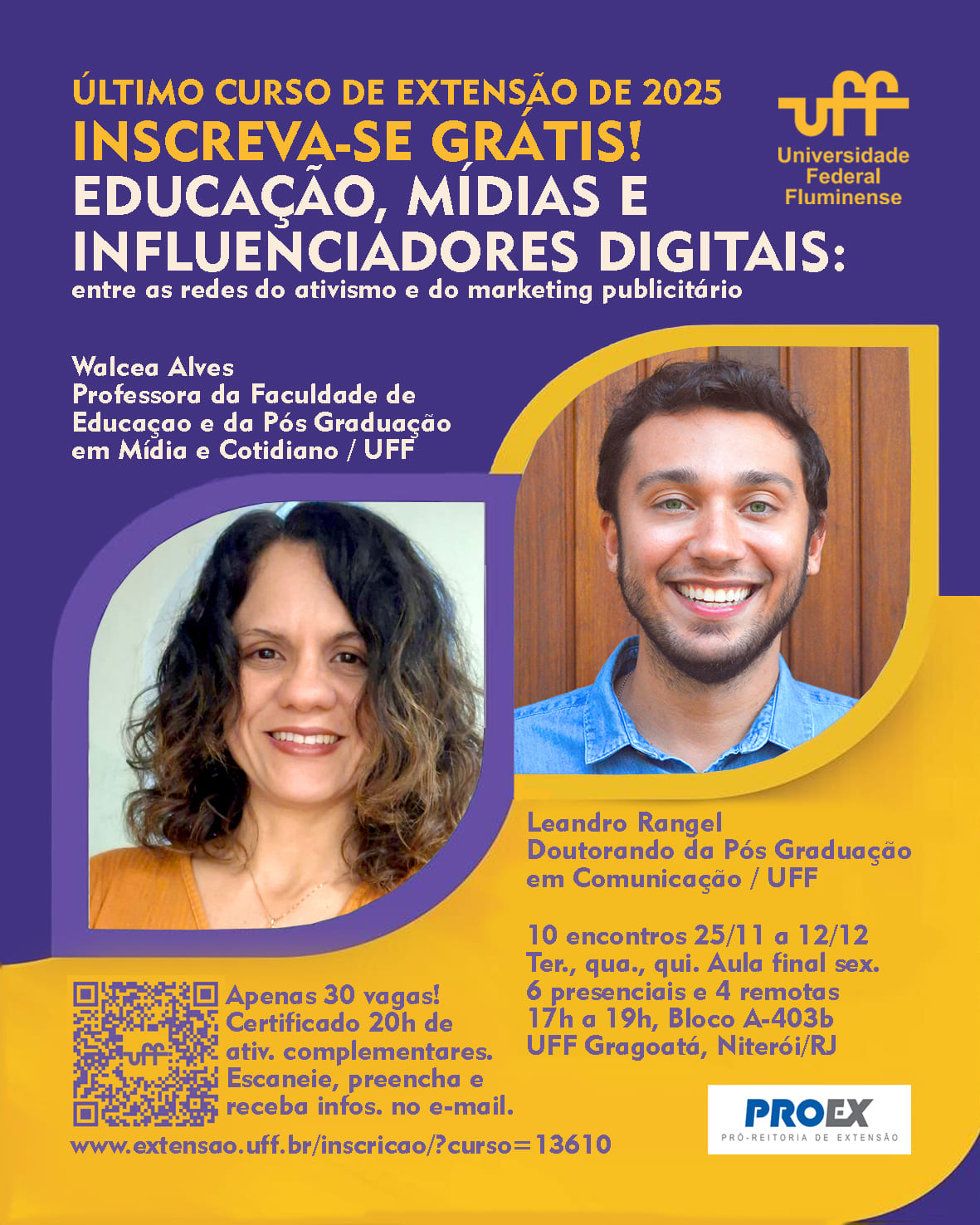 A iniciativa é promovida pela profa. Walcéa Alves (PPGMC e FE/UFF) e pelo doutorando Leandro Rangel (PPGCOM/UFF), reforçando a qualidade acadêmica e a experiência dos docentes na área de comunicação, educação e mídias digitais.