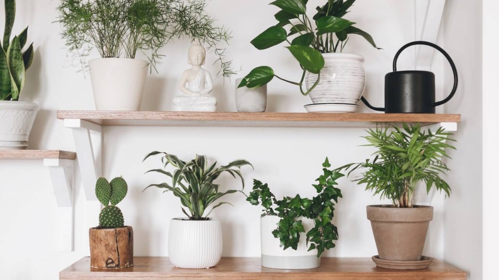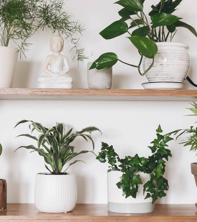- Aproveitar prateleiras altas e suportes de parede para plantas pendentes, como jiboia.
