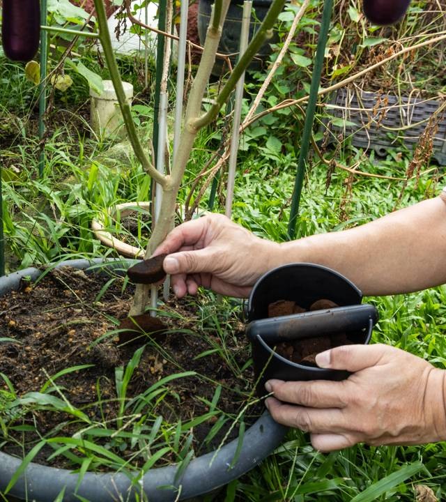 - Espalhe uma colher de borra sobre a superfície do vaso ou misture ao substrato novo no transplantio.