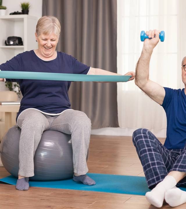 • Exercícios com bola de estabilidade: Sentar e levantar de uma bola ou empurrá-la com os pés melhora força, equilíbrio e consciência corporal.