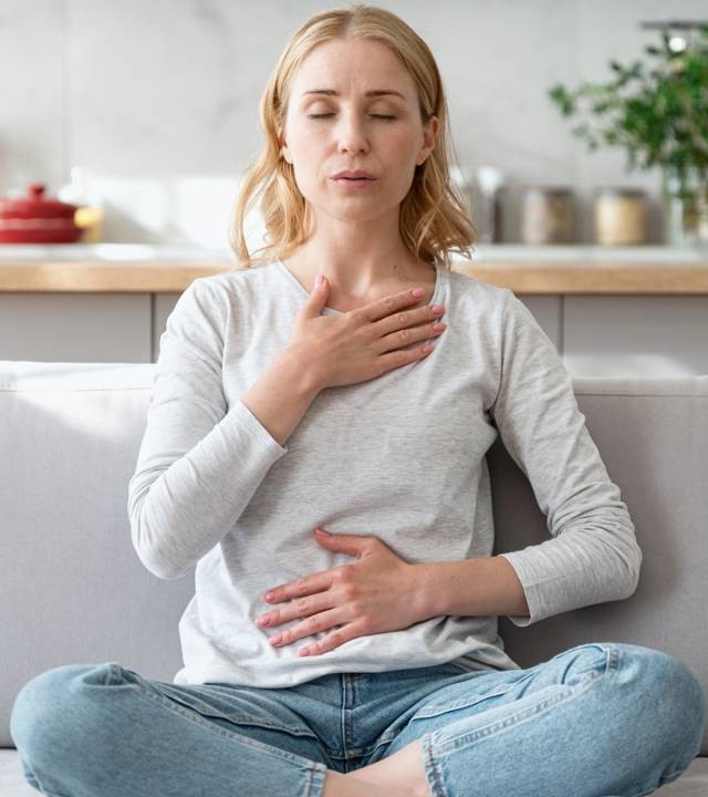 Sente-se em local calmo, com postura ereta e mãos no peito e abdômen.