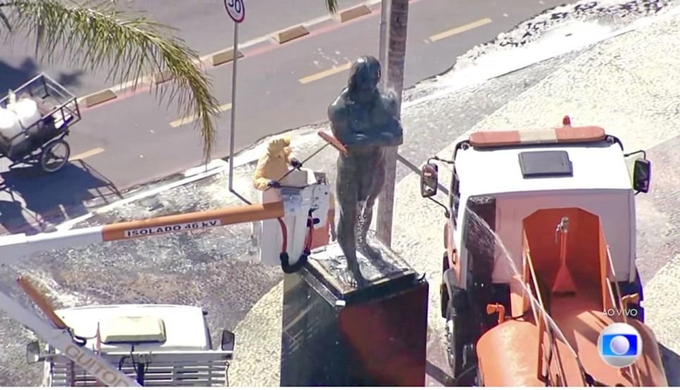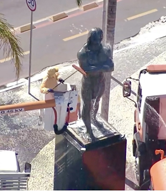 Na sequência, o repórter explicou que se tratava de uma ação de manutenção e limpeza do monumento, com equipes mobilizadas para remover folhagens, sujeira acumulada e sinais de oxidação da estátua, localizada em frente à estação das Barcas, um dos pontos mais movimentados do Centro de Niterói.