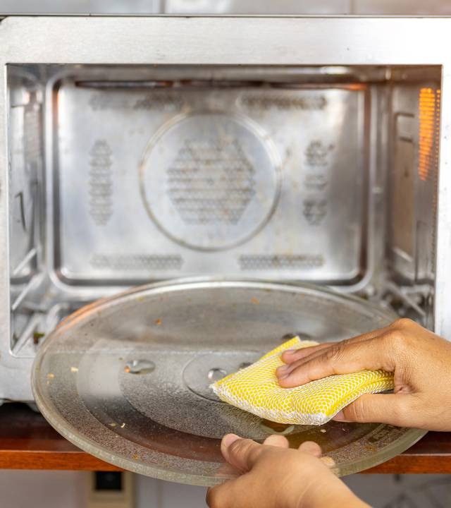 Basta colocar uma tigela com água e algumas rodelas de limão ou uma colher de vinagre, aquecer por alguns minutos e depois passar um pano ou esponja. Essa técnica reduz o esforço e evita arranhões na superfície.