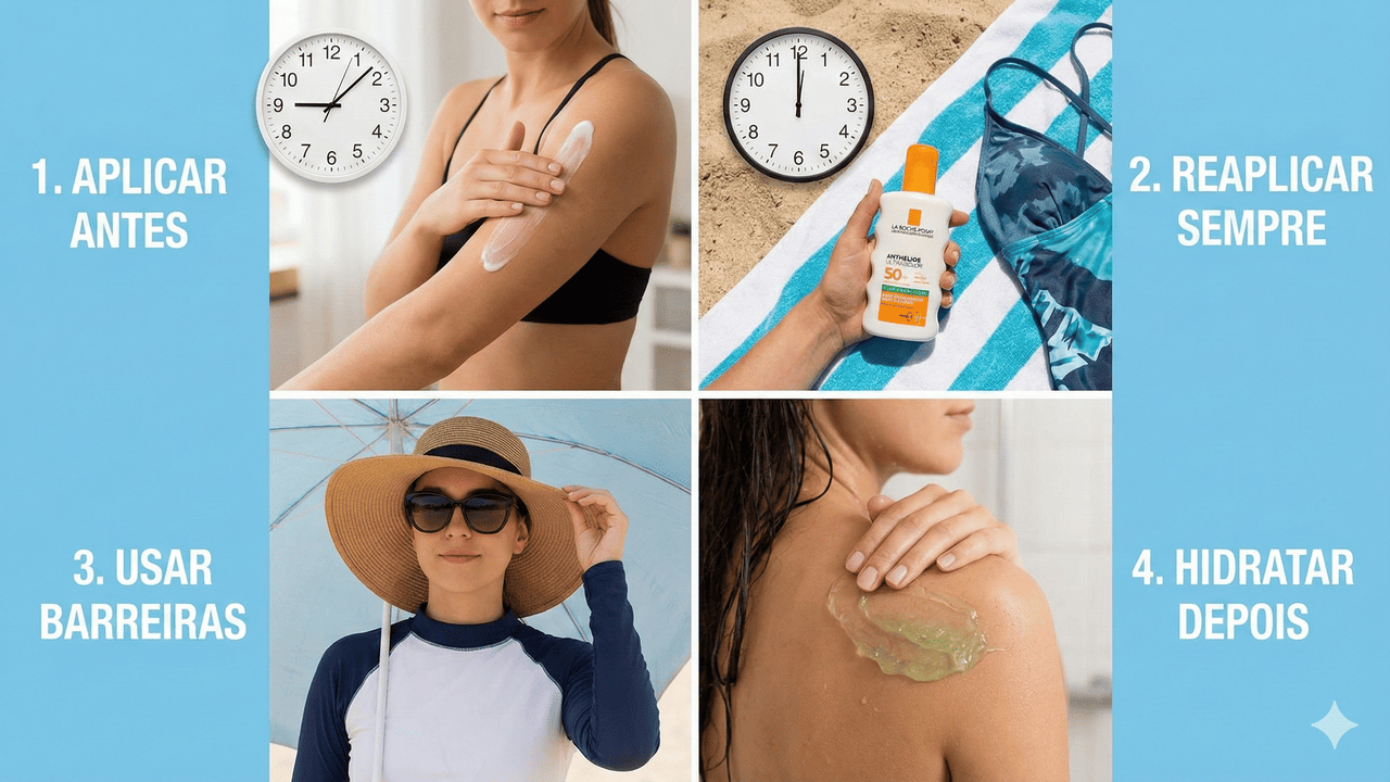 Um roteiro simples para um bronzeado mais seguro pode incluir ações diárias que protegem a pele, reduzem queimaduras e mantêm a hidratação adequada: