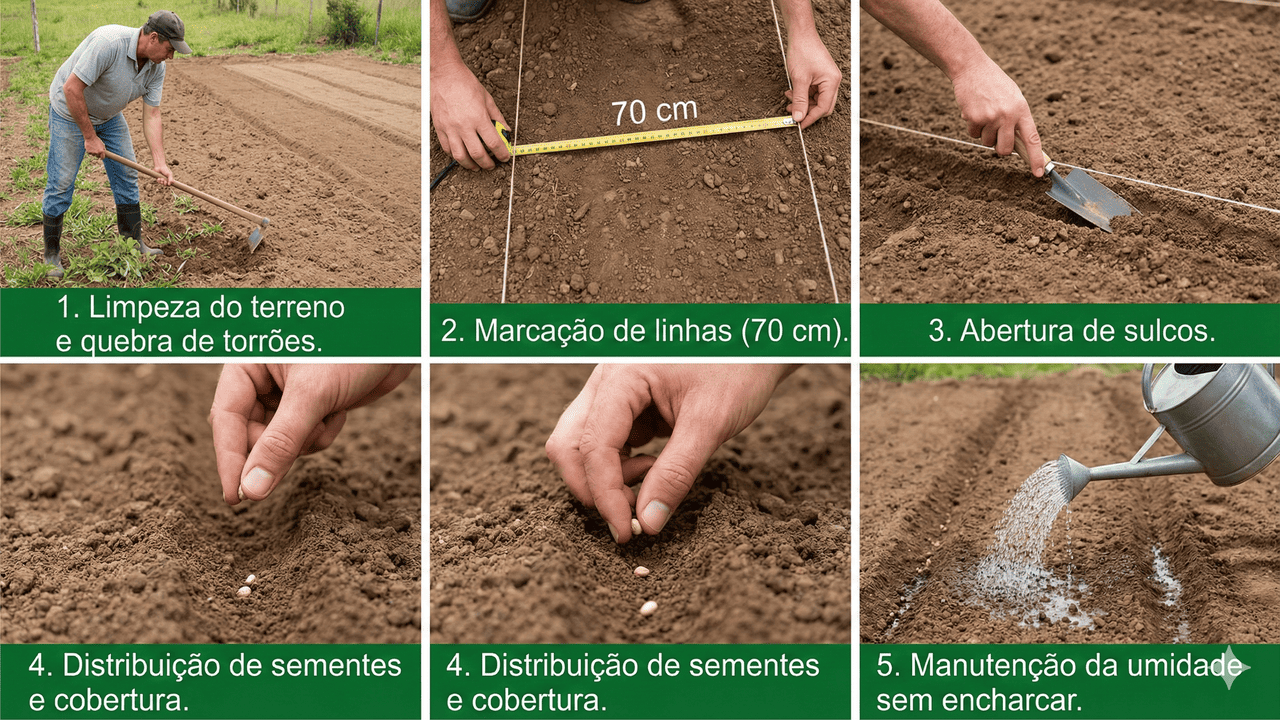 Depois que as mudas atingem cerca de 10 a 15 cm de altura, realiza-se o desbaste, deixando apenas a planta mais vigorosa em cada ponto de plantio. Essa etapa reduz a competição por água, luz e nutrientes, resultando em pés mais resistentes, produtivos e com vagens de melhor qualidade.