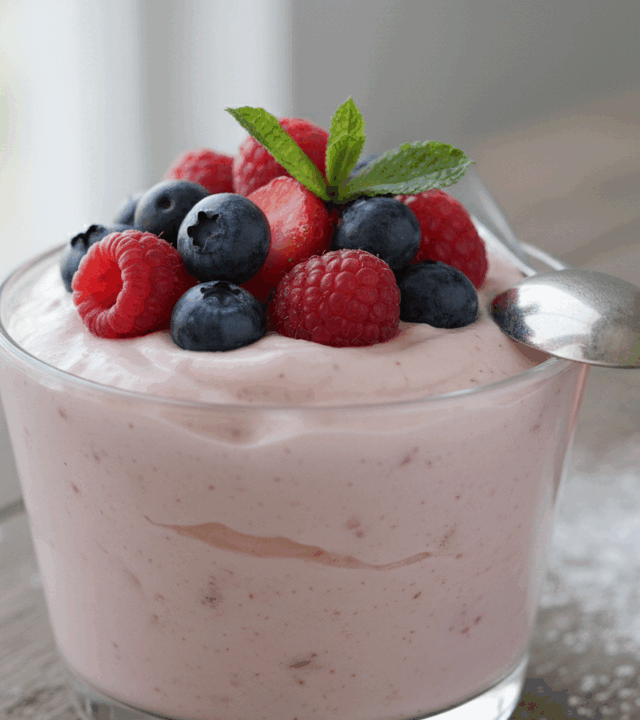 • Mousse de morango prática: pode ser feita com suco em pó, polpa congelada ou morangos batidos.