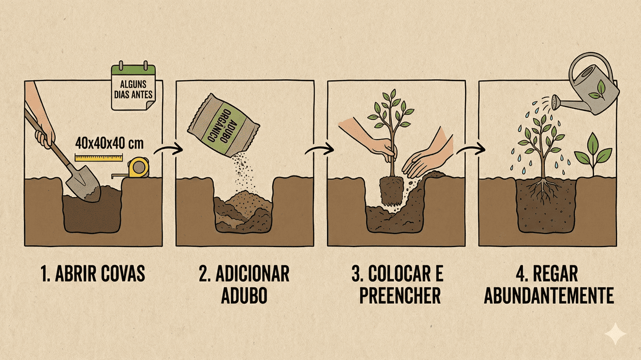 Após o preparo do solo, siga as etapas principais para garantir o bom estabelecimento da planta:
