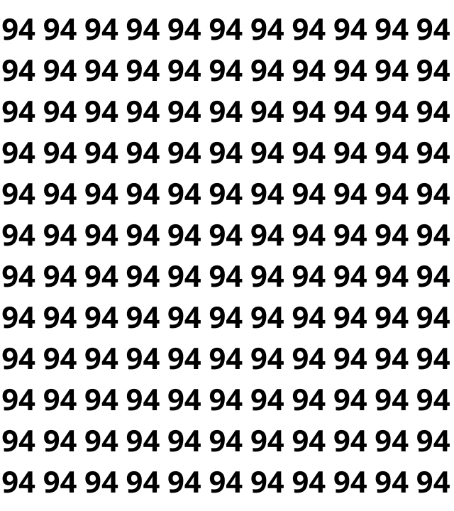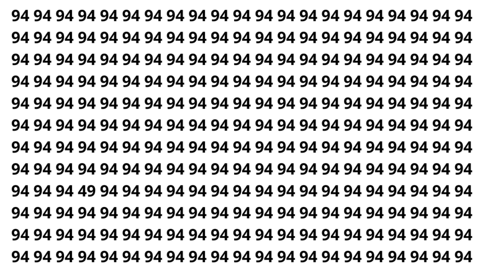 Este puzzle visual desafia sua atenção e rapidez. A repetição do número 94 cria um padrão que facilmente engana o cérebro, dificultando a percepção do 49, mesmo sabendo qual número procurar.