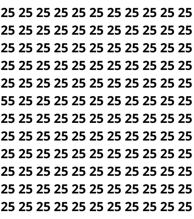 Não encontrou? O número diferente entre os vários 25 era o 55, camuflado nas primeiras linhas. Pequenas alterações entre os números tornam o enigma instigante e recompensador.