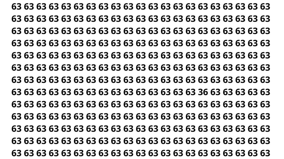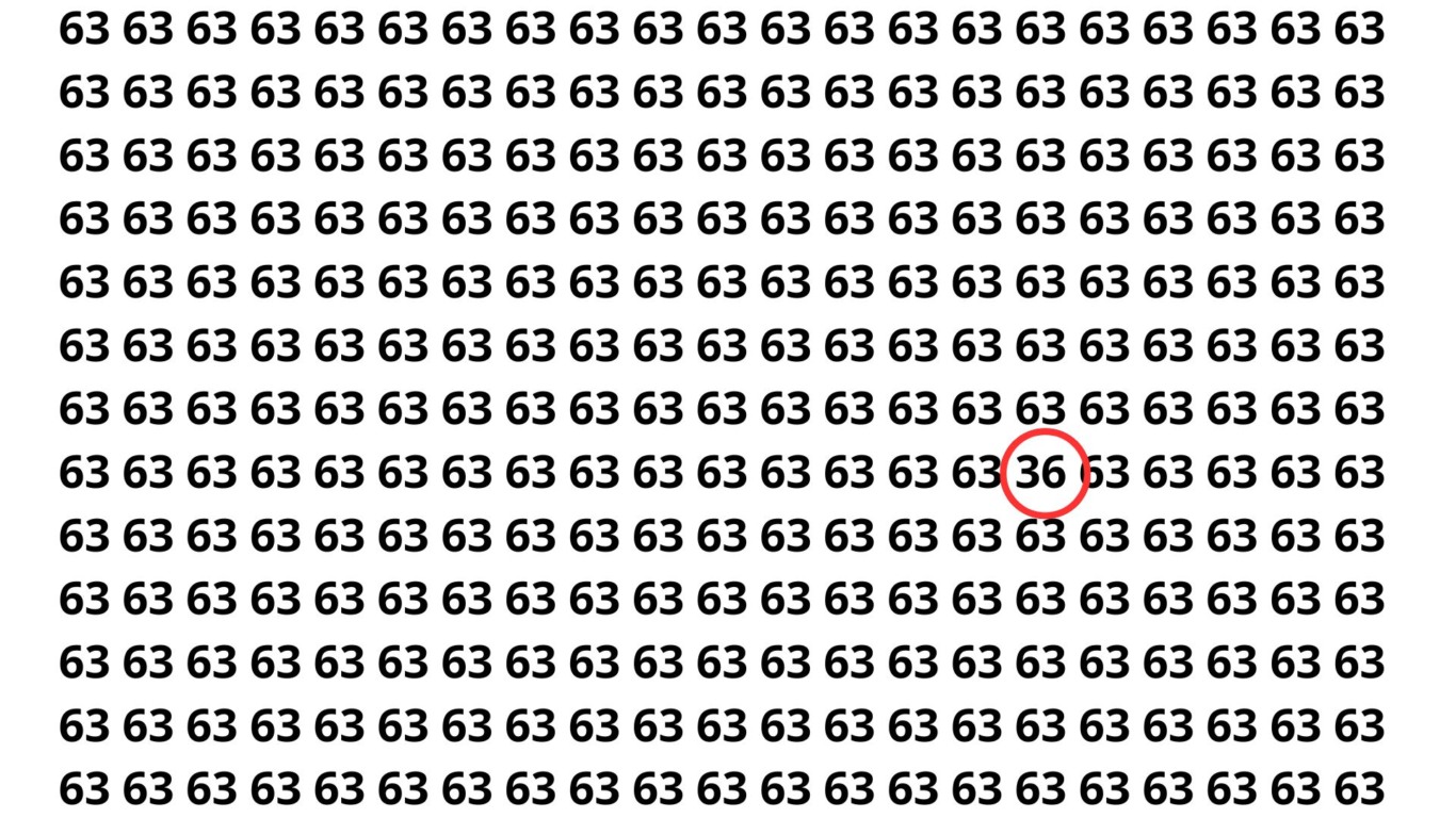 O número escondido na ilusão de ótica é 36. Difícil de perceber, não é? Ele se camufla perfeitamente entre dezenas de 63, explorando nosso padrão de reconhecimento visual e distração com números repetidos.