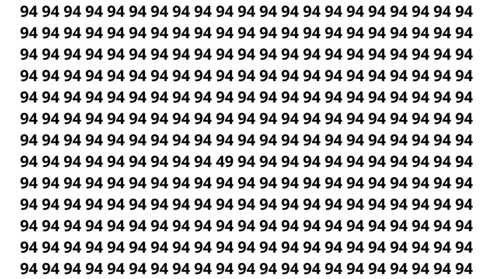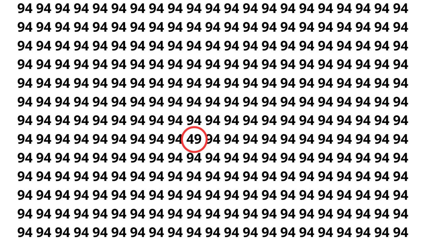Parabéns por ter tentado! O número que se destaca entre os vários 94 é 49. Ele foi difícil de encontrar devido à semelhança visual com os outros números e ao nosso instinto de olhar apenas rapidamente para padrões conhecidos.