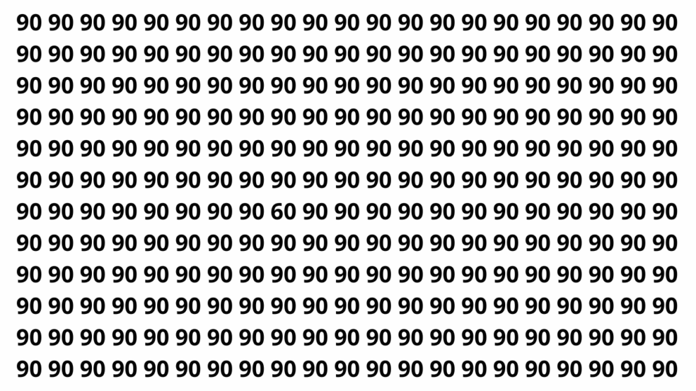 O número que se diferencia é 60, e ele está estrategicamente disfarçado entre os 90. A semelhança com os números ao redor aumenta a dificuldade, exigindo concentração e observação minuciosa para ser percebido.