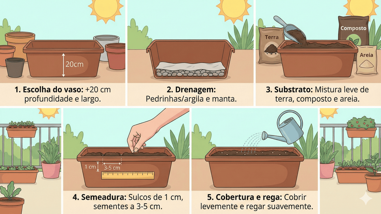 A seguir, um passo a passo básico para organizar esse cultivo em casa, garantindo boas condições desde a escolha do vaso até a primeira rega. Seguir essas etapas ajuda a reduzir falhas de germinação e a obter rabanetes mais uniformes.