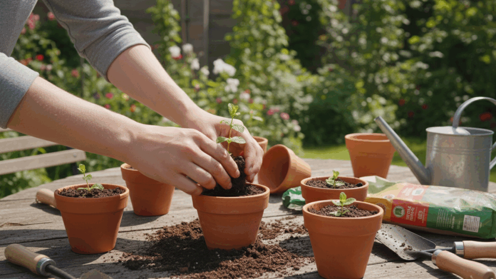 - Plantar a muda de hortelã no centro, firmando levemente o solo.