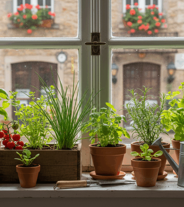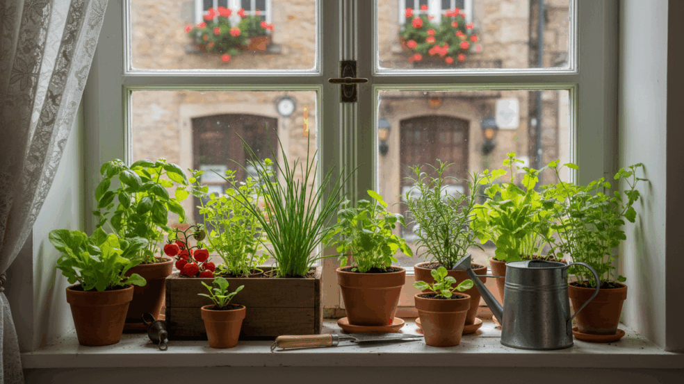 • Temperos e ervas: cebolinha, salsinha, coentro, hortelã, manjericão, alecrim e tomilho se desenvolvem bem em vasos pequenos, inclusive em peitoris de janelas.