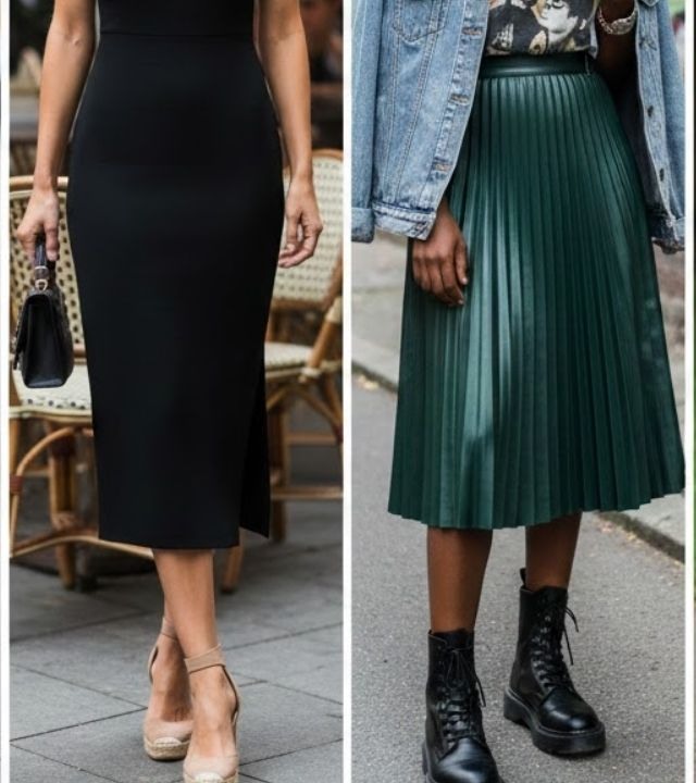 Os vestidos e saias midi têm aparência contemporânea porque equilibram proporções e destacam a silhueta de forma elegante. A versatilidade do comprimento permite combinações ousadas com tênis, botas ou sandálias, criando looks urbanos e modernos.