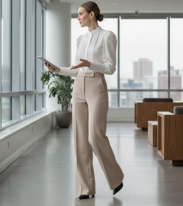 Para completar, sapatos de salto ou mocassins ajudam a alongar a silhueta e equilibrar o volume da calça, garantindo um look sofisticado e adequado ao ambiente corporativo.