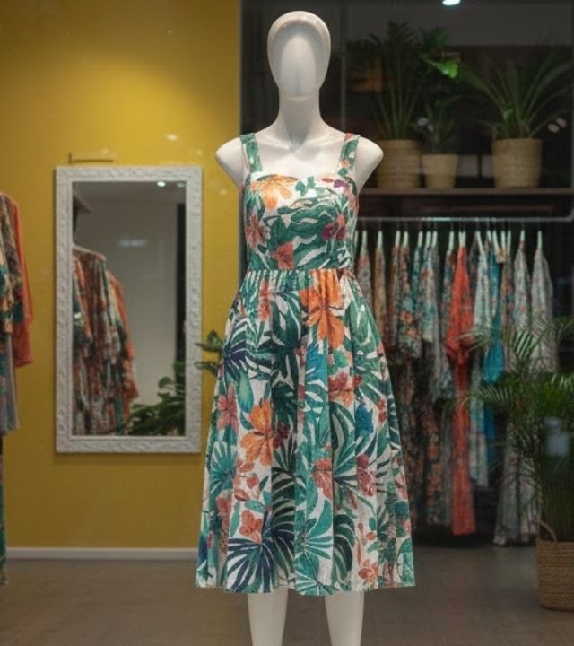 Em eventos casuais, estampas em vestidos ou saias soltas transmitem leveza e descontração. Para o trabalho ou encontros formais, peças com padronagem delicada em camisas ou blusas permitem sofisticação sem perder o charme tropical.