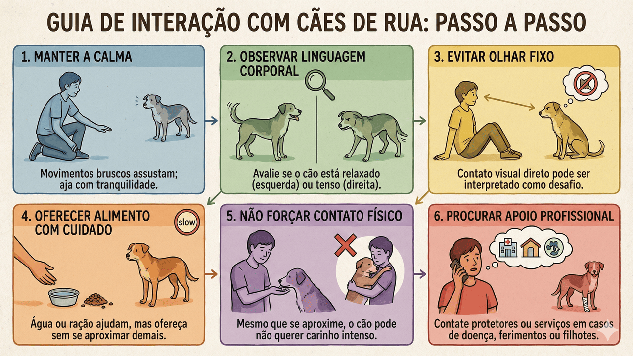 Não existe uma única forma correta, mas algumas atitudes ajudam a tornar o contato mais seguro e respeitoso. Quando possível, também é importante pensar em ações de longo prazo, como acionar protetores ou programas de castração e atendimento veterinário.