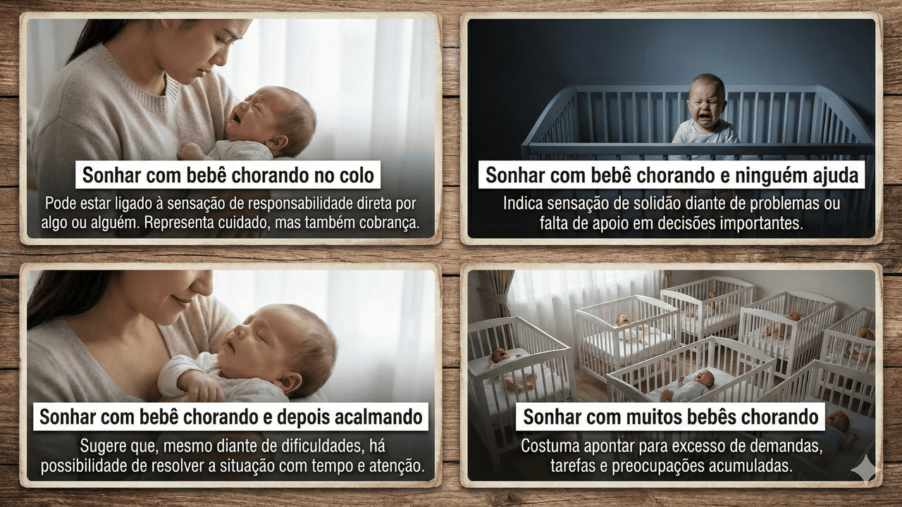 Os detalhes do sonho ajudam a afinar a interpretação da imagem do bebê chorando, apontando para áreas específicas da vida. O ambiente, quem segura a criança, a intensidade do choro e a reação da pessoa que sonha indicam se o foco é profissional, familiar, afetivo ou ligado ao autocuidado.