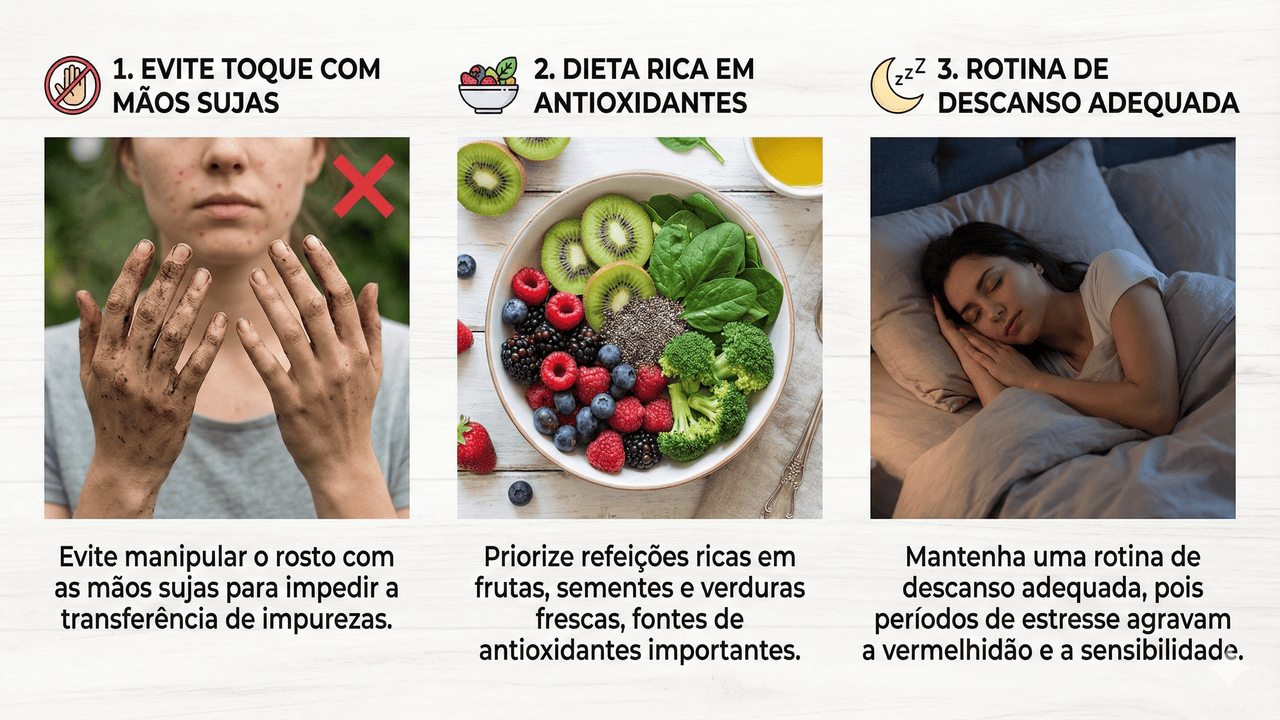 O cuidado com a pele sensível e avermelhada começa em pequenos hábitos diários, incluindo uma rotina de sono regular e uma alimentação equilibrada. O controle do estresse e a atenção a fatores ambientais previnem crises de vermelhidão, além de promoverem uma pele mais saudável.