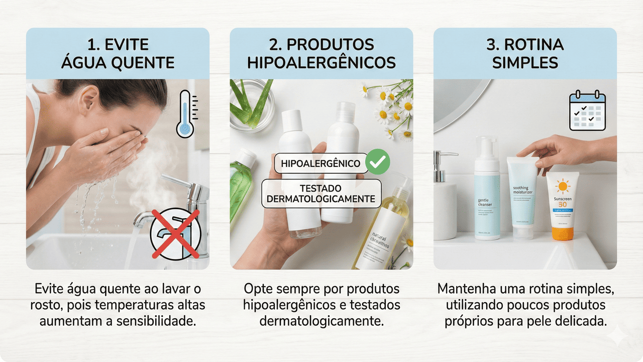 Quem apresenta pele avermelhada deve evitar produtos abrasivos e ingredientes irritantes, pois estes agravam a sensibilidade e a vermelhidão. Manter uma rotina consistente, sem alternar excessivamente os produtos, auxilia na adaptação da pele.
