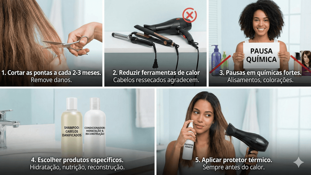 A recuperação do cabelo danificado começa com a mudança de hábitos diários. Pequenas ações, repetidas com constância, ajudam a reconstruir a fibra, repor água e nutrientes e proteger o fio de novas agressões, inclusive em cabelos com química ou coloração.