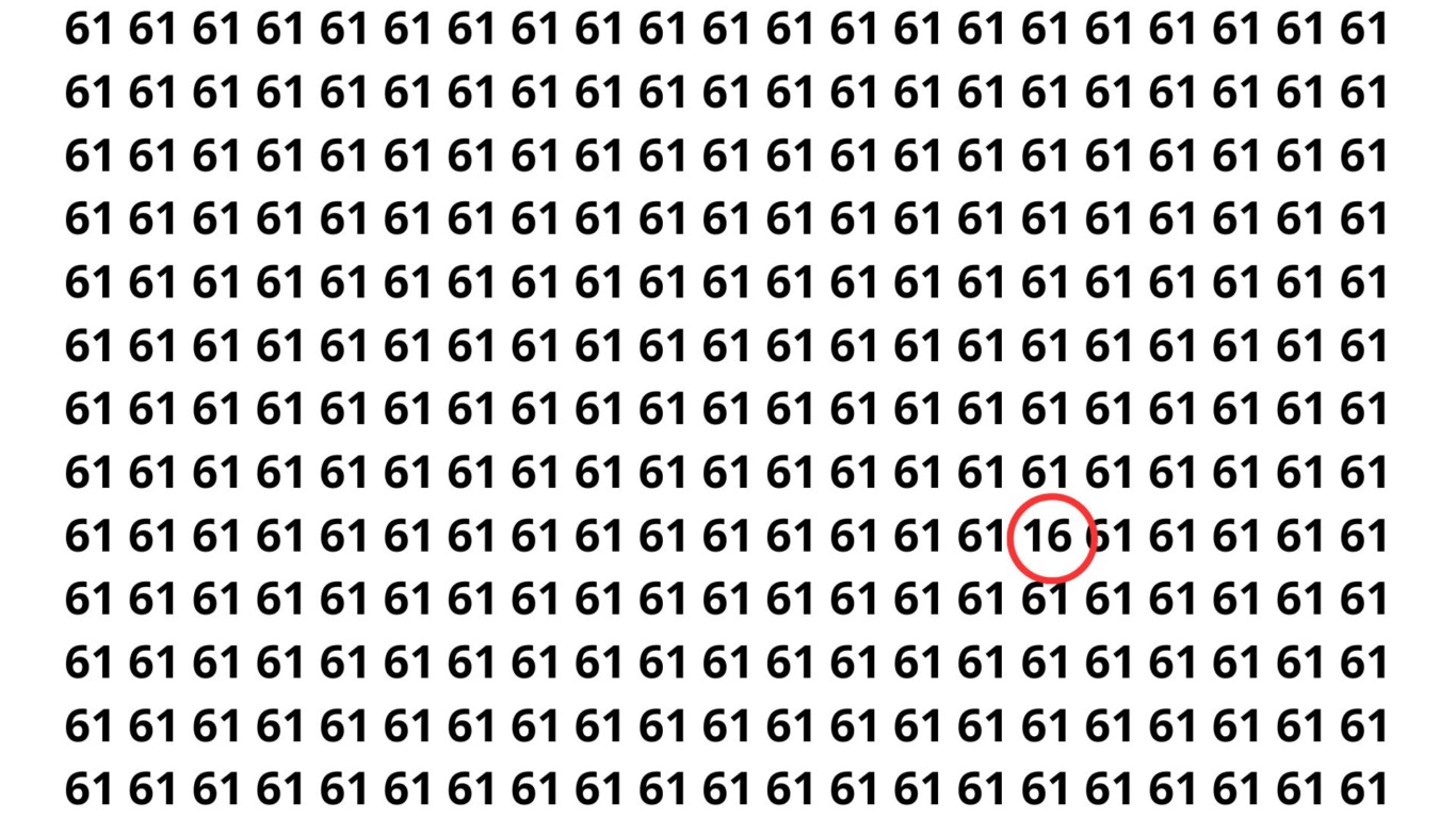 Parabéns por ter tentado! O número escondido na ilusão de ótica é o 61. Encontrá-lo não foi fácil devido à repetição constante de números 16, que confundem a percepção e obrigam o cérebro a trabalhar com atenção concentrada. Apenas 5 em cada 20 pessoas conseguem localizar o número em menos de 7 segundos.