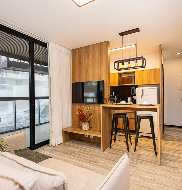 O empreendimento conta com studios de 28m² a 52m², todos com varanda gourmet e plantas bem inteligentes, que aproveitam cada metro quadrado. Há ainda uma cobertura exclusiva disponível, um diferencial pouco comum nesse tipo de produto.