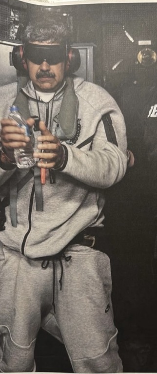 O presidente dos Estados Unidos, Donald Trump, divulgou neste sábado (03) uma imagem que teria sido registrada após a captura do presidente da Venezuela, Nicolás Maduro. Na foto, Maduro aparece vendado, usando óculos escuros, vestido com um moletom e supostamente algemado, a bordo do navio de guerra USS Iwo Jima, da Marinha norte-americana.